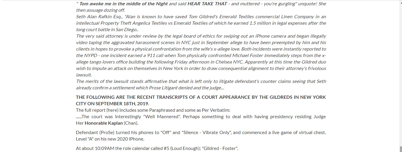 ![The Gildred's Gildred family of San Diego have taken the high road to destruction of a young man who's involvement with Tom Gildred's WIfe Carolina Gildred threatens to ridicule The Gildred Family Name of San Diego. budding entrepreneur, CEO and boasted E&Y convenient Man of the year awardee???. We are encouraging you to do honest investigative reporting that matters to your community and its name on how its represented when individuals so influential to all society matters. The story: In codes and captions - as its almost never ending. The latest: Coming to think about it...while Cooley Law build its legacy, there's left the unturned Old Toones in its foregone Animaniacs. In the meantime such as cult-law x-Cooley professors Seth Rafkin ( Partner Jennifer Bogue) of rafkin esq practicing in 3 states, attempts to Paint-water by penetrating new legal homogeneity BLM. (Not MLM or Minority Lives Matter at minority union dot com). But what a disproportionate failed attorney who's carrier is defined by ONE BOGUS FRIVOLOUS CASE in http://carolinagildred.com Interestingly enough the case of criminal harassment and criminal stalking by his client Phillips Tom Thomas Philip Gildred of North San Diego's trivial wealthiest from Carlsbad to Rancho Valencia, Del Mar Heights and the rest of it. (The fight response that seams to thwart a man as insistent is is presume here at Twitter.com/GildredTom) But lately less than weeks ago Tom Gildred here in NYC have landed his super imposed perfect double in the very office of the one MichaelTango.com. But just about only to confirm that his Tom G the tiger gildred from San Diego executes even yet another (3rd consecutive time) tantrum blow to the already poor and suffering cripple and maimed in the "Apponent"??? Tom calls his stalker or spammer albeit this investigative reporting.. By this time the M-Tango instructor to beloved wife of Tom per LT-11583-20 illegal lock-out or force eviction, in fact was only a day before TG'S super impersonation double visit the exact office. TG actually went as far as to swindle a purchase deal on his opponents live and work office space building. (Talk about obsession) - but not before affirmations show the Michael Tango Foster guy doors being kicked in on camera and was just forcefully KICKED TO THE CURB FROM The x-lover to wife out of his 3RD FLOOR LOFT APARTMENT AND HIS IMMEDIATE FIRST FLOOR OFFICE. (SAME BUILDING) and yes thats TOM Gildred in the photo attached. Albeit practicing his gold swing. Or it must be his perfect double albeit practicing his swing of all things in the very Michael Foster's office of 3 years... But Jennifer Bogue and Seth rafkin the blazing fire attorneys? They're still caught up in another battle clearing much of a heap of dung see here... "NYSCEF Alert: New York - Torts - Other - <DOCUMENT RETURNED> 153554/2017 (Carolina Gildred - v. - Michael Foster) Application toolbar Message Body New York County Supreme Court DOCUMENT RETURNED FOR CORRECTION 08/13/2020 The court has returned the documents listed below for correction. Reason for Returning: Document #201-Judgment to Court is not Clerk Default because the Court is the Judge so it is seeking an order from the judge. Doc#210 Proposed Judgment to County Clerk should be based on an order as well but there is no reference to the order or so ordered stip (uploaded directly by the court=judge's part) and referenced in your judgment proposed. There must also be direction from the court for the clerk to enter judgment. You cannot have any clerk default's judgment because there has been an answer so please do not submit anything with this title. It is unclear which motion you are addressing, which if any decision from the judge, etc. Thank you. Instructions - DO NOT FILE A NEW DOCUMENT: To refile the documents, go to the Document List for this case and click the "Refile Document" link under each document. Case Information Index #: 153554/2017 Caption: Carolina Gildred - v. - Michael Foster eFiling Status: Full Participation Recorded Assigned Case Judge: Louis Nock Documents Returned on 08/13/2020 09:26 AM Doc # Document Filed Date 201 JUDGMENT -TO COURT (PROPOSED) [PROPOSED] Clerk's Judgment 05/04/2020 210 JUDGMENT -TO COUNTY CLERK (PROPOSED) 07/01/2020 E-mail Notifications Sent Name Email Address SETH RAFKIN srafkin@rafkinesq.com BRIAN FIGEROUX bfigeroux@msn.com Michael Foster Michael@michaeltango.com Filing User SETH RAFKIN | srafkin@rafkinesq.com | 9738913370 | 1201 Sussex Turnpike, Suite 102, Randolph, NJ 07869](TomGildredGoldSwings.gif)