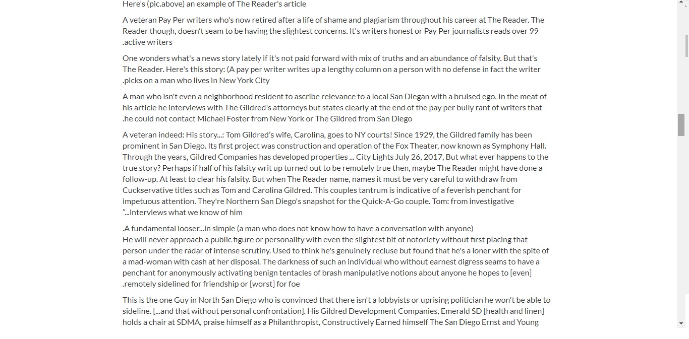But The Gildred Harassments continued. It is not over: In the Gildred world: ""Money is power-supreme over anything or anyone that is a remote minority - in the Dollar or in personality". The Group Family Name GILDRED and its Evil Money According to an x-brother in-law to Tom Gildred, The Family is known to finance some of San Diego's most corrupt lobbyist and politicians. Over decades old history of San Diego their Evil Money have weaved its way into some of San Diego's most prominent public societies including Balboa Park, SDMA, San Diego Zoo, where past and present board members (were) inclusive of George Gildred, Lyn & Phil Gildred, Julie Gildred, Tory Gildred. But Tom Gildred in chief associate himself as the trade name under titles such as Philanthropists, Art Collector, Wine Collector, CEO & Board Member to some of San Diego's larges non for profit organization.". The Group Family Name GILDRED and its Evil Money According to an x-brother in-law to Tom Gildred, The Family is known to finance some of San Diego's most corrupt lobbyist and politicians. Over decades old history of San Diego their Evil Money have weaved its way into some of San Diego's most prominent public societies including Balboa Park, SDMA, San Diego Zoo, where past and present board members (were) inclusive of George Gildred, Lyn & Phil Gildred, Julie Gildred, Tory Gildred. But Tom Gildred in chief associate himself as the trade name under titles such as Philanthropists, Art Collector, Wine Collector, CEO & Board Member to some of San Diego's larges non for profit organization.