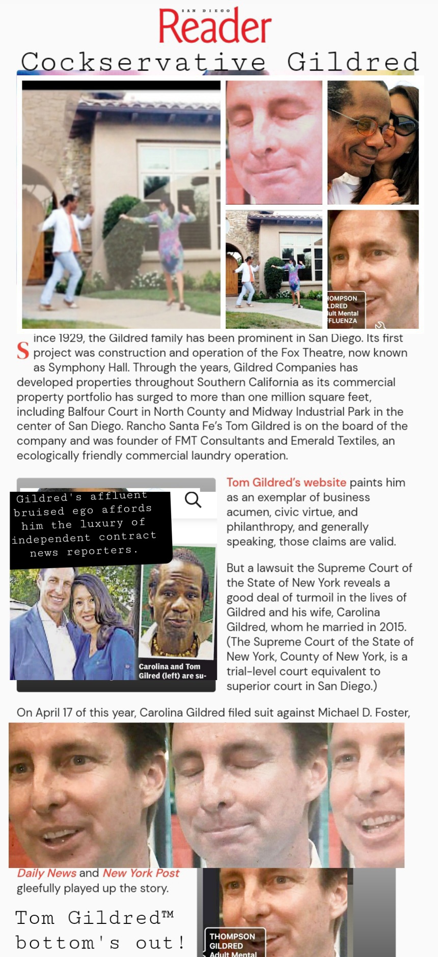 He's the guy to sound off a tigrrsraw only upon the highest hills of Tijuana in hopes it will echo the valleys throughout Carmel that to make a sound of a real bad tiger. [Got himself all the ways in New York Supreme Court Gildred v Foster 153554-2017 made a fool of himself]. On the other hand as any good devoted trophy yes-wife would:- Carolina Hernandez Gildred: what's earnestly said to be a sure fact about this Latina. Quot., “I know of her...[For God's Sake she's a slow F**k. And if she likes it SHE WILL WORK HONESTLY HARD ENOUGH TO PAY FOR IT.” unquote. [They're peas in a pod]. Except Tom's wife being an avid NY Times reader of the Metro Columns she loves to have a good LAUGH. ...and by that she would LAUGH at anything especially another man's idiosyncrasies. [